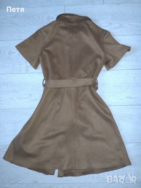 Роклята е като нова. Велурена, в мек карамелен цвят, отпред е с копчета от горе до долу и коланче.