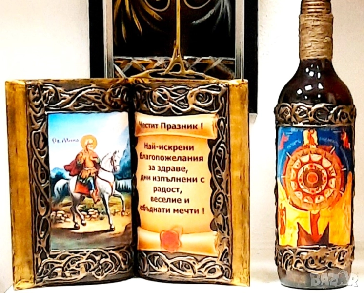 Оригинален, авторски комплект от книга-икона с оригинално пожелание за всеки повод и празник - рожден, и имен ден, златна сватба и др. с бутилка Дървото на живота, декорирана с истински монети и съдържание.