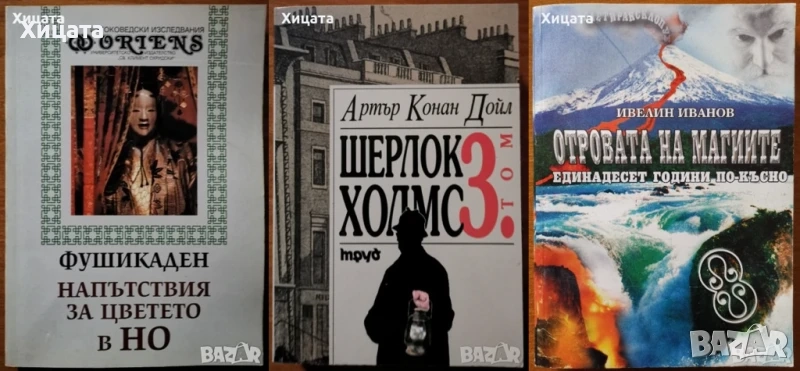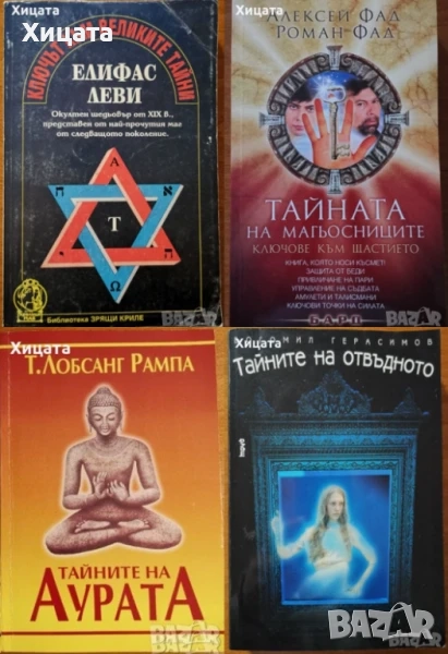 Шерлок Холмс.Том 3,Артър Конан Дойл,Труд,2008г.528стр.Нова! - 125лв Фушикаден.Напътствия за цветето в НО Дзеами Мотокийо,УИ "Св. Климент Охридски",2000г.160стр.Отлична! - 60лв Отровата на магиите.Единадесет години по-късно,Ивелин Иванов,РИГ,2004г.254стр. - 60лв Космически спусък.Том 1-2,Робърт Антон Уилсън,Дилок,2002-2003г.608стр. - 199лв. Тайните на отвъдното,Богомил Герасимов,Труд,2003г.408стр. - 50лв. Хилядолетието, Фелипе Фернандес-Арместо,Прозорец,1999г.628стр. - 50лв.Ключът към великите тайни,Елифас Леви,Кралица Маб,344стр. - 80лв Тайните на аурата,Т.Лобсанг Рампа,Изд.Зограф,1999г.176стр. - 40лв Тайната на магьосниците.Ключове към щастието,Алексей Фад,Роман Фад,Бард,2012г.206стр.Отлична! - 90лв Кой си ти?365 рождени дати и техните астро-нумерологични профили,Христо С.Енев,Екс-Прес,2012г.444стр.Включва Вечен календар! - 95лв Числа и съдби:Ключ към разбиране на миналото,настоящето и бъдещето,А. Ф. Александров,2006г.384стр. - 95лв Шабоно,Флоринда Донър,Прозорец,1992г.304стр. - 100лв. Джобна енциклопедия на гаданията,Джейн Джонстън, Мая Пилкингтън,Изток-Запад,2011г.628стр.- 40лв. Сун Дзъ и изкуството на войната в бизнеса,Марк Макнийли,Фокус,2010г.328стр. - 40лв.
