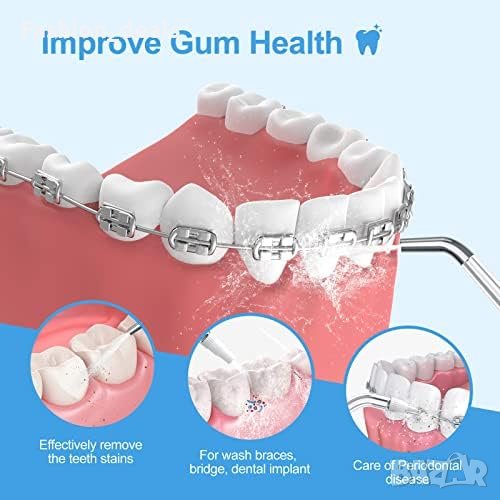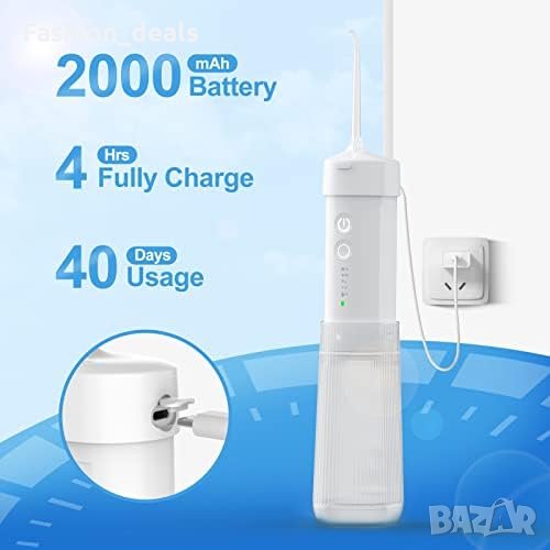 Ефективно почистване с 1400 пулсации/мин и 140PSI налягане Компактен и преносим дизайн, сгъваем до 14 см 5 режима + DIY, 4 дюзи с 360° въртене 180ML воден резервоар, IPX7 водоустойчив 2000mAh акумулаторна батерия, до 3-4 седмици употреба