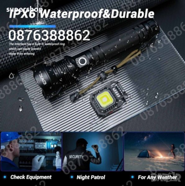Този фенер е водоустойчив до IPX65, за да се предпази от воден спрей във всяка посока.