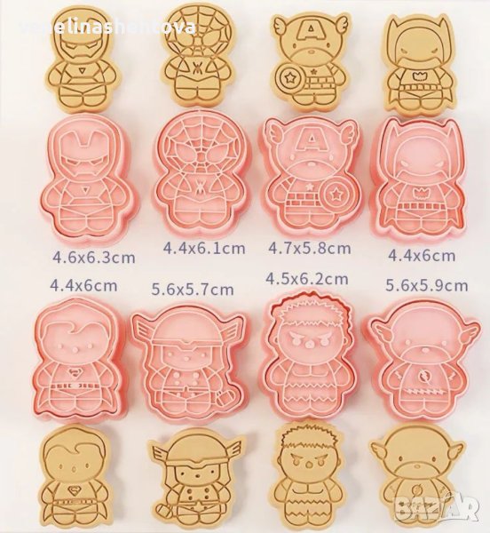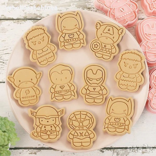 8 броя 3D разглобяеми форми за бисквитки с героите на Марвел, Спайдърмен, Хълк, Аърън мен, капитан Америка ,изработени от устойчива пластмаса. Подходящи за маслено тесто, бутер тесто, и тесто за курабийки.