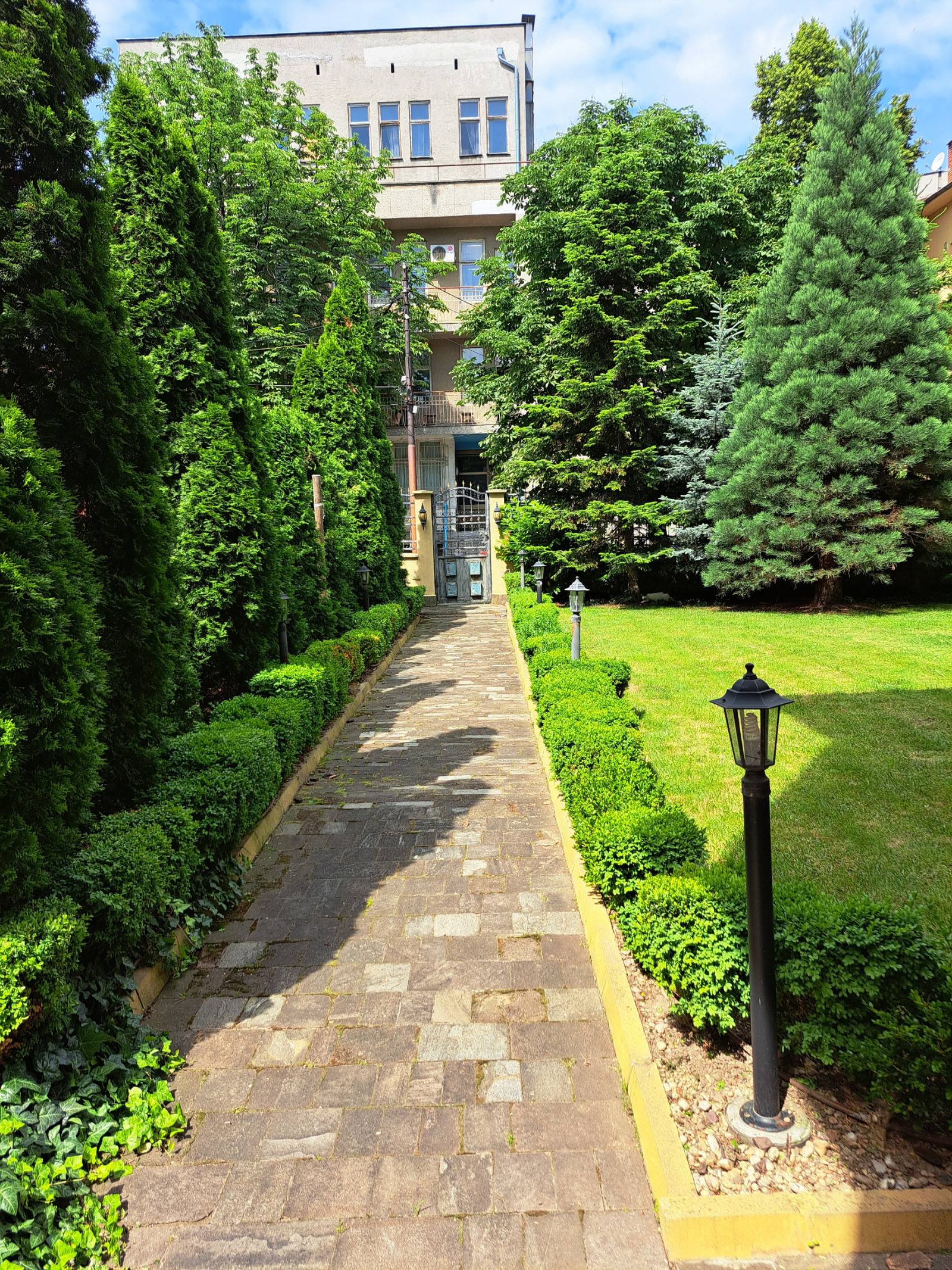 Състои се от 4 самостоятелни етажа с общо 16 стаи и еднакво разпределение. На всеки етаж има луксозно обзаведен и оборудван кухн. бокс, три стаи, балкон и санитарен възел. Входовете са два от към партера и от 1-ви етаж на къщата.