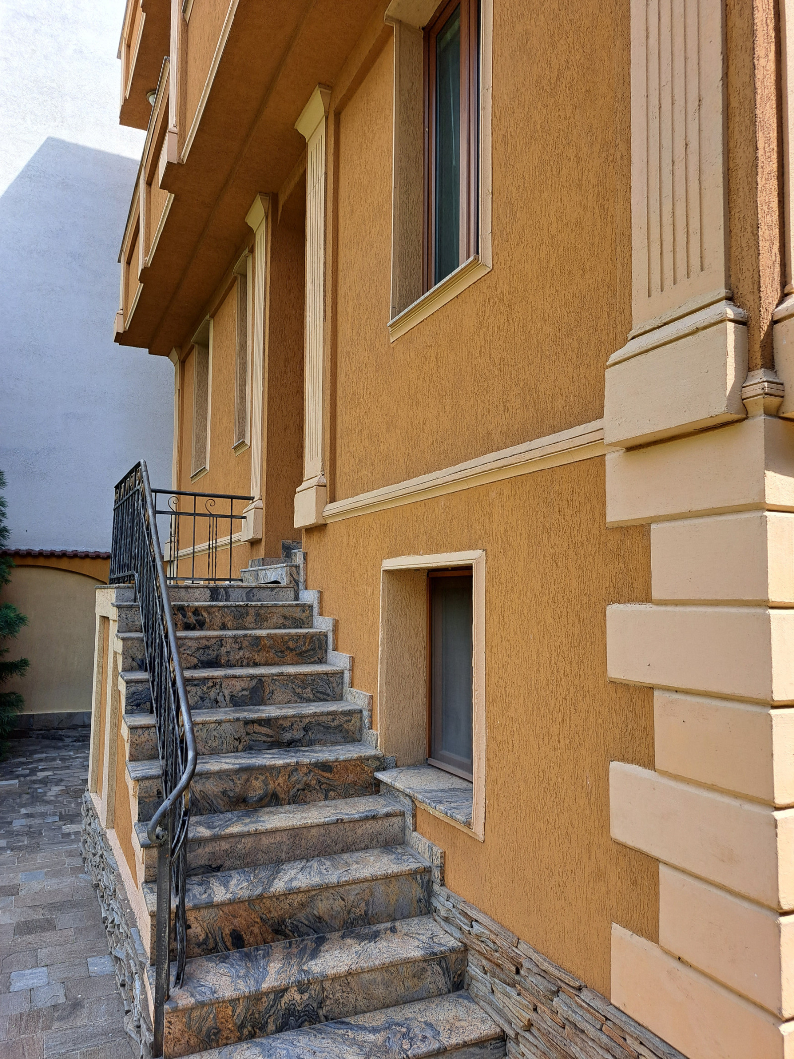 Стълбището е от бразилски цветен гранит със стилен парапет от ковано желязо.