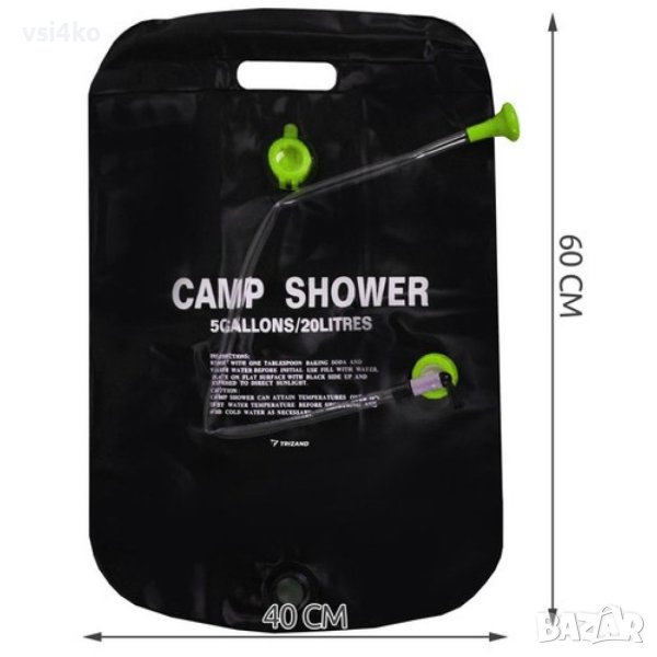 Практичен душ за навсякъде, където нямате достъп до вода и електричество – за къмпинг, за парцел, за палатки, екскурзия, разходки с велосипед и др. Също така идеален за морския бряг, за да можете да изплакнете солена вода след къпане.