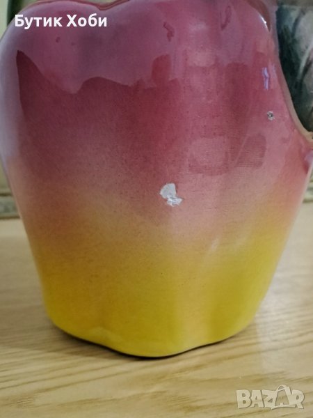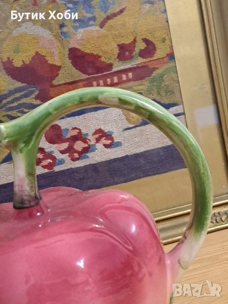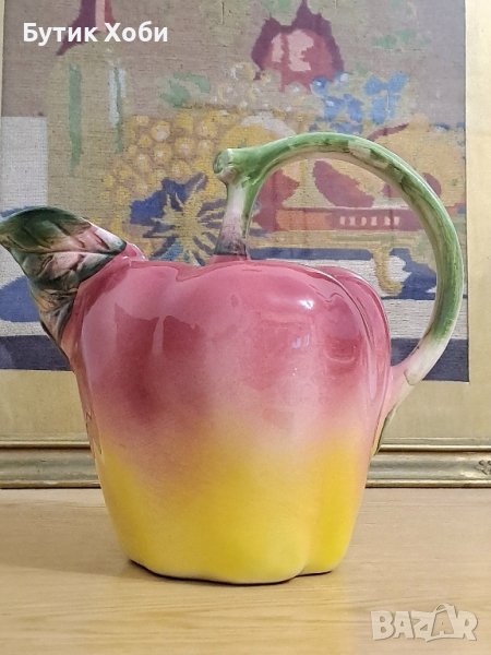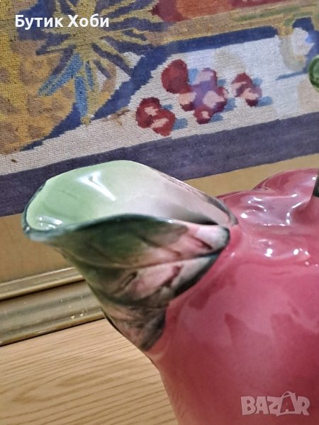 Интересна дизайнерска кана ,,Ябълка,, Майолика, ръчно изработена и декорирана от 60-70-те години. Налични маркировки.Забележки - малки шупли около 4 - 7мм ( снимки)Размери - 20 × 22см. Чудесна е !