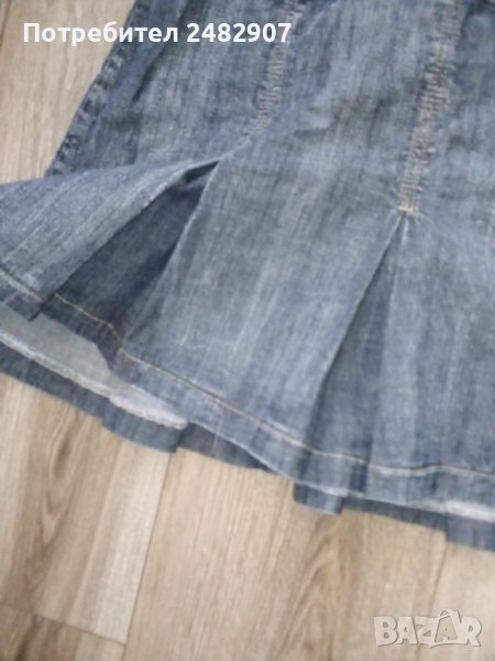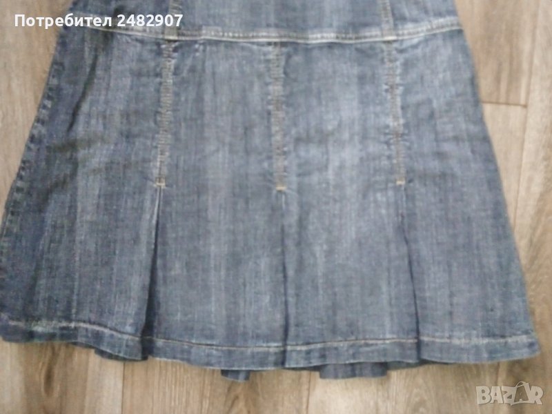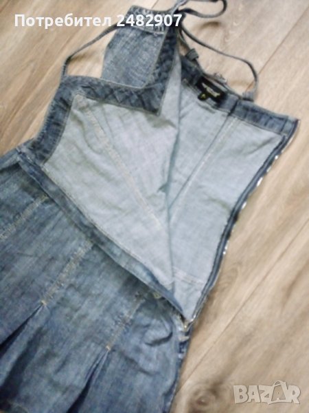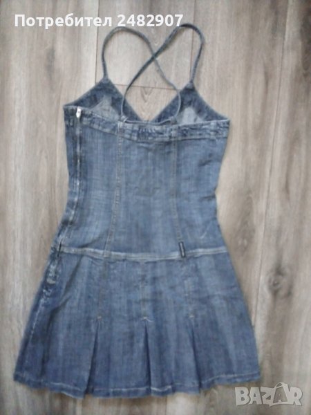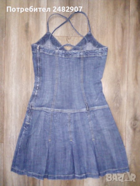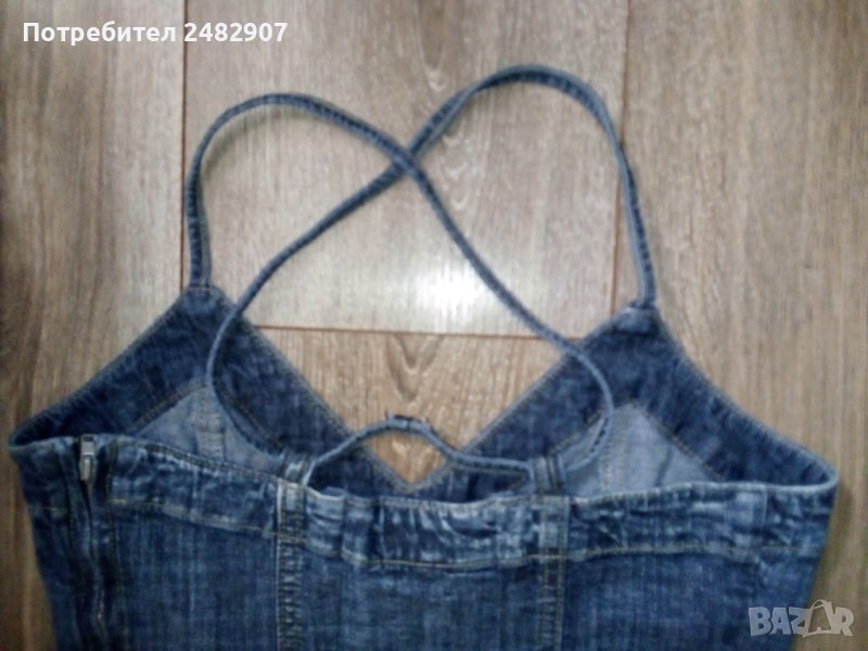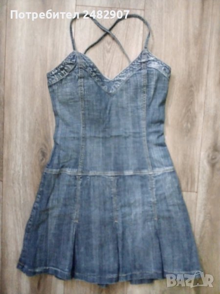 Черна дънкова рокля с ефектен гръб, размер S. Съдържа 98 % памук и 2 % еластан. Ширина под мишниците - 37,5 см, ширина в талията - 39 см, дължина от горната част на презрамките до долу - 81 см. Много запазена, почти не е използвана, плисирана в долната част, закопчаване със страничен цип отляво, дълъг 37 см.