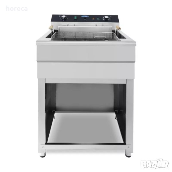Включеният от неръждаема стомана шкаф предоставя удобна работна височина и лесен достъп до кошницата. Осигуреното пространство за източване на маслото прави процеса на смяна бърз и удобен през крана в долната част. С гладката си повърхност от неръждаема стомана, фритюрникът е лесен за почистване.