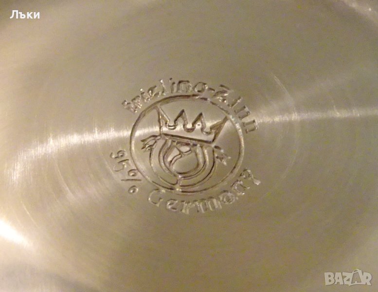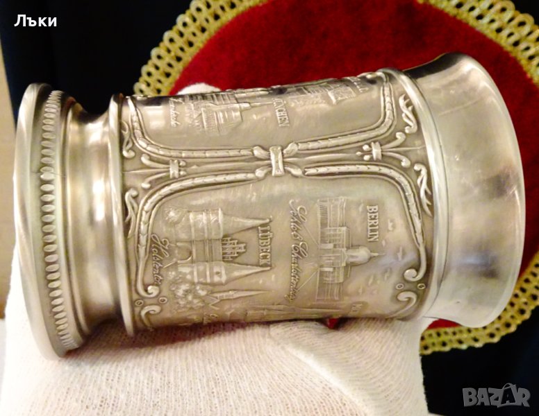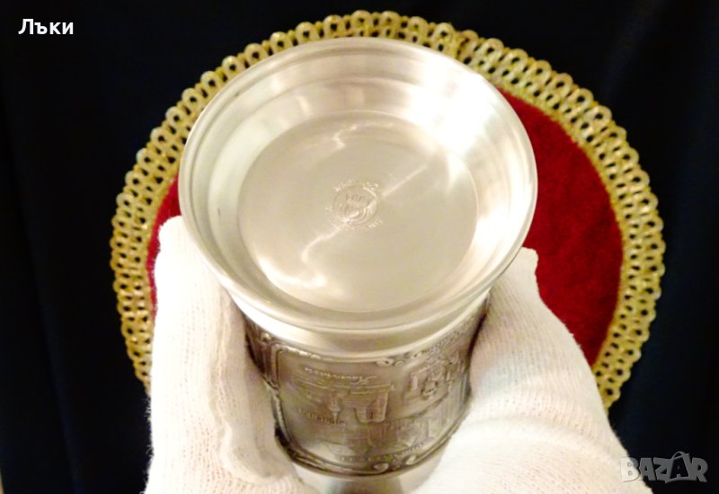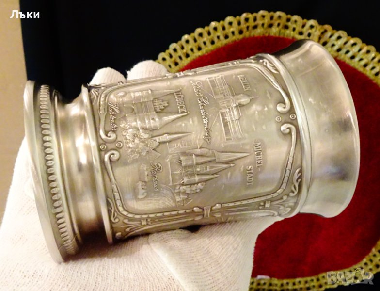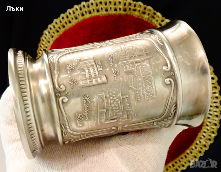 калай и 5% сребро,маркирана.Декорирана с релефни сгради,паметници на архитектурата и красиви орнаменти.Височина 11 см.,диаметър 7.5 см.,тегло 205