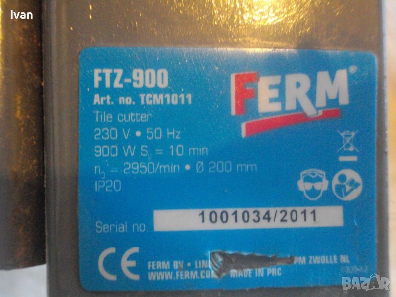 ОПИСАНИЕ на 900 вата ф 200 мм диск машина - 399 лв. Марка и модел - FERM FTZ-900. Холандски произовдител, произоводство базирано в КНР. Производител - FERM /страна производство - P.R.C. /година производство - 2011. Запазен външен вид на машината и ОТЛИЧНО техническо/работно състояние. Без забалежки. За сухо и морко рязане. Ваната под диска при мокро рязане липсва, но може да се постави всякакви друг пластмасов съд с подходящи размери като тавичка с вода под диска. Мощност на амшината - 900 вата. За големи дискове размер ф ф 200 мм. Поставен на амшината оригинален почти нов режещ диск диамантина ф 200 мм.Скорост на рязане - 2950 об/празен ход. Еврощепсел с защита 10 ампера, бушон и 2 бутона. Клас IP 54. Вписано време на работа с един пуск - S2 - 10 min. Голям, масивен горен плот, с размери 500 х 400 мм, разграфен от двете страни до 20 см. Ъгъл8наклон на рязане 0-45 градуса. Тегло на машината - 11,5 кг.