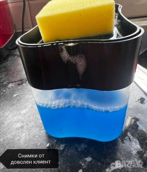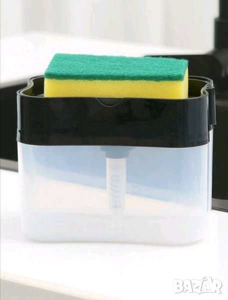 - 2 в 1 диспенсър за препарат за миене в комплект с кухненска гъба. - Всичко, което е необходимо да направите, е да напълните диспенсъра с препарат за почистване и след това да натиснете с гъбата. Така ще получите бързо необходимото количество препарат за миене на една чиния.