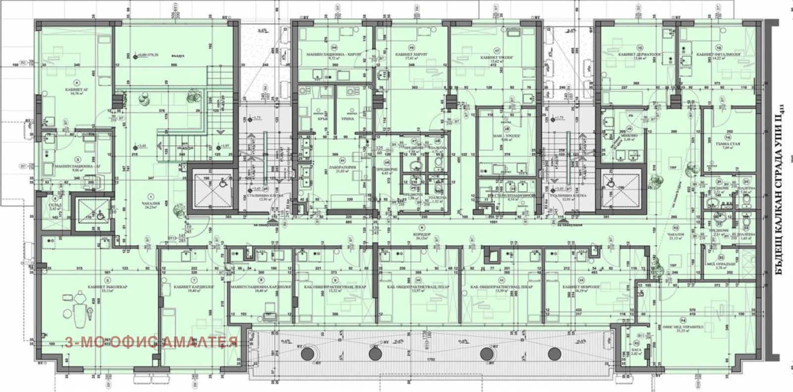 Медицинският център е разпределен на два етажа с разгъната застроена площ 573,79 кв.м. и обща площ 666,31 кв.м.. Първо ниво е на партера, със ЗП 102,20 кв.м. и включва регистратура с чакалня, кабинет, манипулационна и тоалетна. Към втория етаж има асансьор и вътрешни стълби. Второ ниво е със ЗП 471,59 кв.м. и включва 13 кабинета, лаборатории, помощни помещения, приемни, манипулационни, чакални и санитарни помещения.