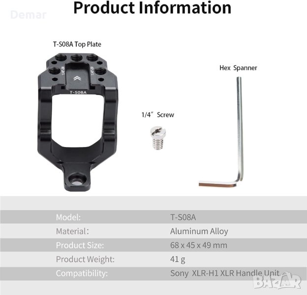 Представяне на горната плоча на дръжката Nitze T-S08A XLR, шедьовър от алуминиева сплав, пригоден за дръжка Sony FX3 / FX30 XLR-H1 XLR. Защитете дръжката си с гумени подложки, които предотвратяват надраскване. Инсталирането е лесно – закрепете XLR горната монтажна плоча на дръжката към горната страна на дръжката с помощта на 1/4" винт. Подобрете настройката си с многобройни 1/4" отвори с резба, отвори за локализиране и студена обувка, привлекателни аксесоари като LED светлини , безжични предаватели и монитори. С тегло само 41 g, тази плоча се отличава с лека издръжливост, допълнена от превъзходното разсейване на топлината от алуминиевата сплав. За оптимални резултати обмислете сдвояването на XLR горната плоча с Nitze XLR удължител за дръжка T-S08B за цялостно решение.