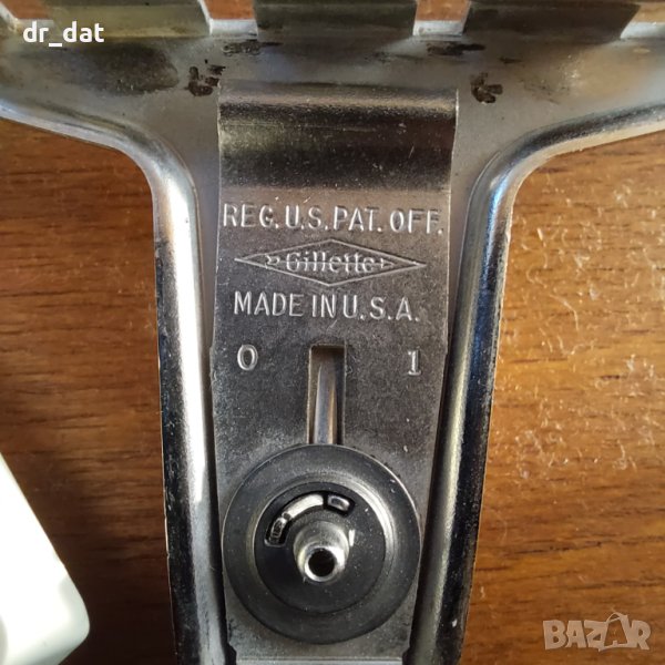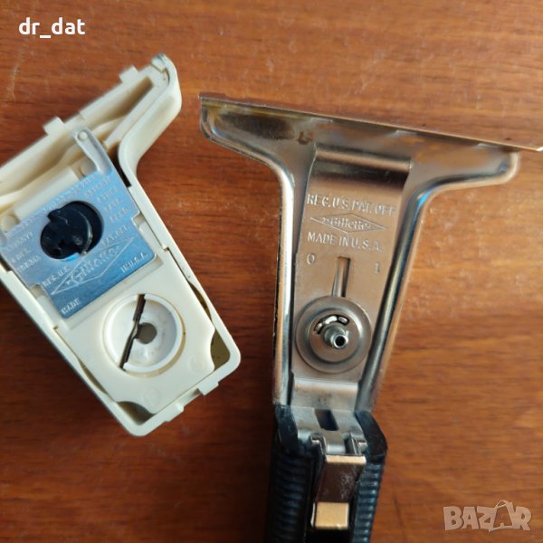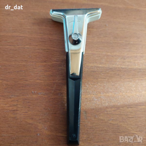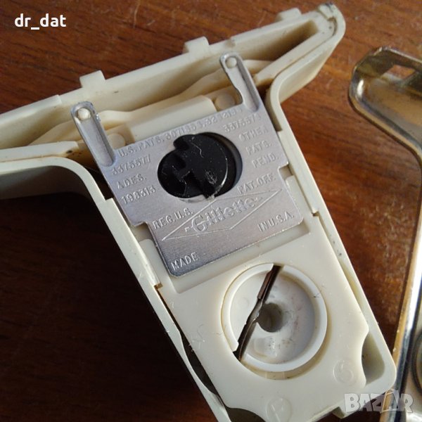 Много интересна самобръсначка от 70-те години. Изключително технологична - има лента в сменяемата глава, която се върти и се променя бръснещата част. За съжаление има нещо счупено в пантичката, която закопчава главата. Не пада много лесно, но според мен не става за бръснене. Идеална е за декорация или колекция.
