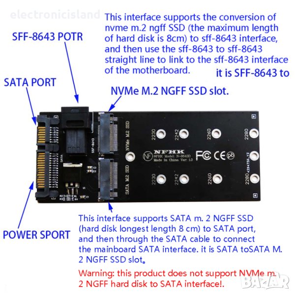 Не може да поддържа преобразуването на SATA m.2 ngff SSD в sff-8643 (тоест U.2) използване на интерфейс или nvme m.2 ngff SSD се преобразува в 2,5-инчов SATA интерфейс!