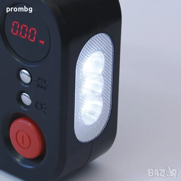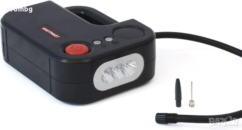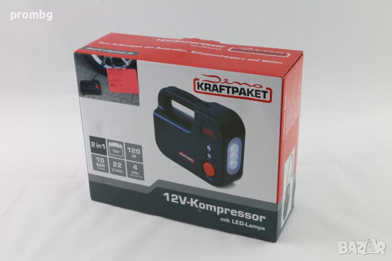Комбиниран 12 V компресор с вградена LED лампа, немски, внос от Германия. Дебит на въздуха: 22 л / мин. Номинална мощност: 120 W, Максимален ток: 10 A, Максимално налягане: 10,3 бара / 150 PSI, LED лампа: 3 x 1 W светодиод, Работна температура: -20 ° C до + 50 ° C, Тегло: 1115 g, Размери: 21 х 17 х 7 см, Дължина на захранващия кабел: Прибл. 2.75 м, Дължина на маркуча на сгъстения въздух: Прибл. 52 cm, LCD дисплей, показващ налягането. Маркучът за сгъстен въздух, захранващият кабел и адаптера могат да се съхраняват във въздушния компресор.