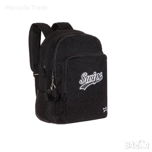 Ученическа раница черен плат с блясък и бродерия. Има 2 големи джоба, джоб за лаптоп, малък преден джоб и странични джобове. Има подсилени гръб и долнище, регулируеми презрамки и дръжка.