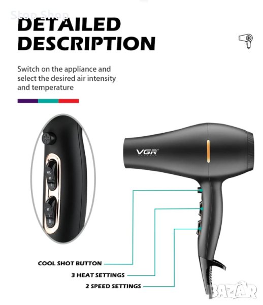 - ✔Спестете ценно време сутрин или вечер, като изберете VGR V-433 1800 до 2200 вата професионален сешоар с 2 скорости + 3 настройки за нагряване и бутон за охлаждане, който фиксира стила на място. Усъвършенстваната Nano Ionic технология заедно с постоянен силен въздушен поток, който идва от професионалния мотор, ще направят косата ви копринено гладка, без влага.