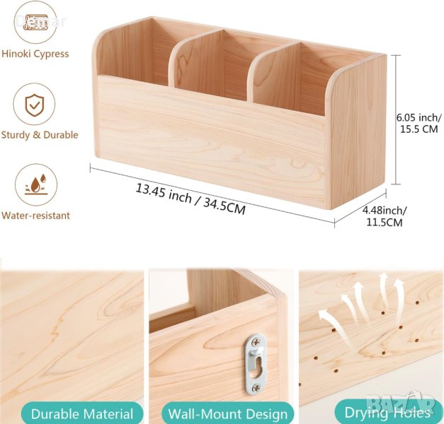 Открийте поставката за прибори, изработена от първокласно дърво Hinoki Cypress, която се отличава с издръжливост и устойчивост на влага. С отличителна дървесна текстура, този държач излъчва елегантност, като същевременно излъчва мек аромат на естествено дърво, който избледнява с времето. Неговият размер от 13,5 x 4,5 x 6,1 инча (34,5 x 11,5 x 15,5 cm) включва три отделения, предлагащи достатъчно място за съхранение на съдове за готвене или прибори, осигурявайки подреден плот и оптимизирано кухненско пространство. Гениалният дизайн включва пропусклив отвор в долната част, улесняващ чистотата и осигурява гъвкавостта на дръжка или окачване на стена. Освен за кухненска употреба, този универсален държач побира различни артикули, от офис консумативи до патрони с четки за грим, повишавайки както организацията, така и естетиката.