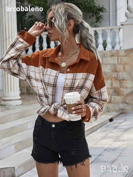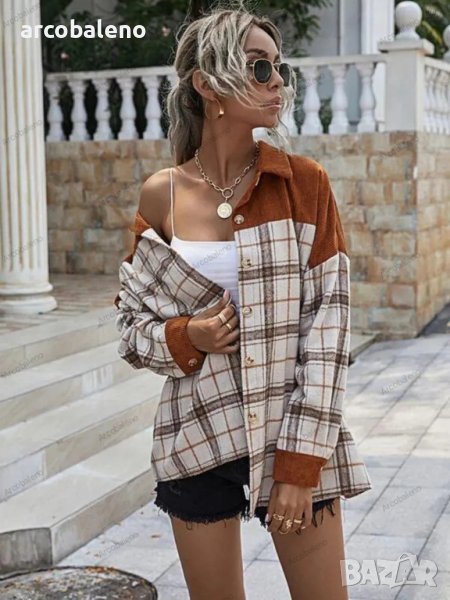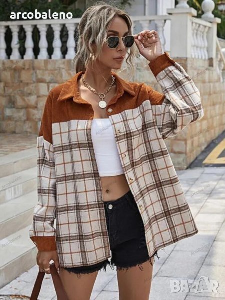 Дамско преходно яке с дълъг ръкав от рипсено кадифе и карирани шевове - 023