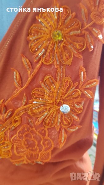 Продавам дамска блуза, цвят керемида, с красива бродерия. Снимана е на детски манекен, но стои много красиво и оформя бюста.