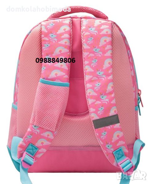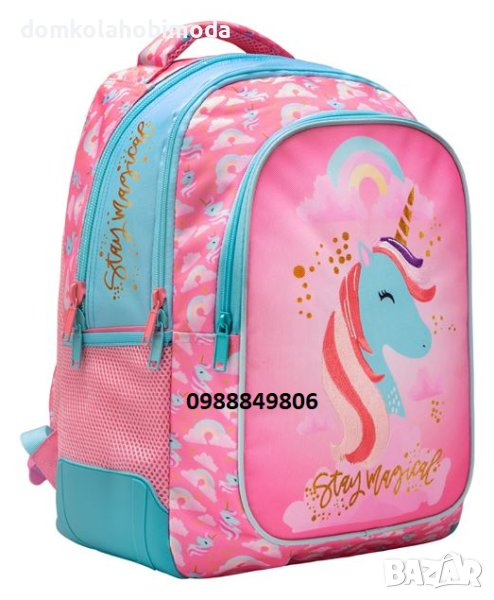 Ученическа чанта - раница, розов тюркоаз с дизайн на еднорог с бродерия грива. Има 2 големи отделения, преден джоб, мрежести джобове за бутилки , ергономичен гръб, подсилена дръжка, подсилени презрамки със светлоотразителни ленти за маркиране, джоб за организиране, подсилено дъно и издръжливи ципове. Подходящо както за ученици от началните класове, така и за тийнейджъри.