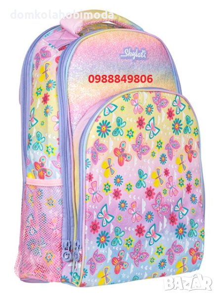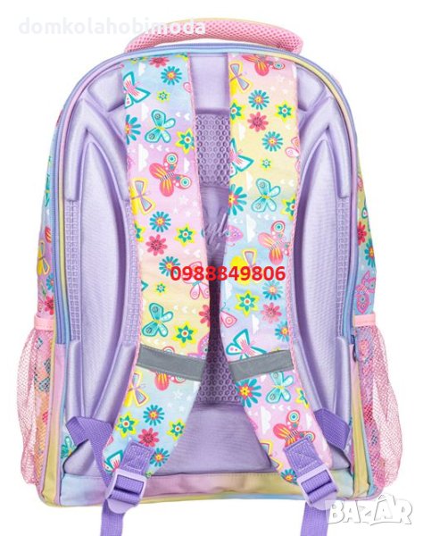 Ученически несесер - раница с дизайн на цветни пеперуди с блестящи детайли, 2 отделения и един джоб, издръжливи ципове, мрежести странични джобове, анатомичен гръб и ергономични презрамки и удобна дръжка.