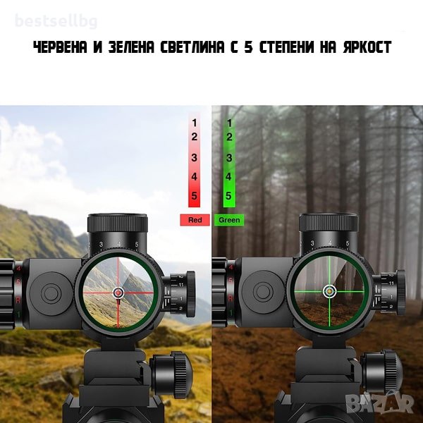 Изборът между червено и зелено осветление, със съответните 5 нива на яркост, ви позволява да се адаптирате към различни условия на осветление. Мерната мрежа Mil-dot ви помага да визуализирате целта си по-ясно, а настройката със стойност при кликване от 1/4 инча при 100 ярда дава възможност за точно прицелване.