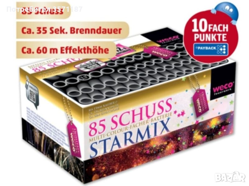 Фойерверки Weco fire emblem Калибър 11 mm, Височина на Зарята до 50 m 1 x 100-изстрелна мултиефектна батерия .Време на зарята 70секунди.С ярко оцветени светещи звезди в червено, синьо, оранжево и светло синьо 1 x 120-изстрелна ревачка Inferno батерия Бързостреляни мощни въздушни ревущи осигуряват впечатляващо Sound Inferno 2 x 19-изстрелови батерийни комети с чудесен филигранен букет от златни звезди.Линк към зарята в уoutube: