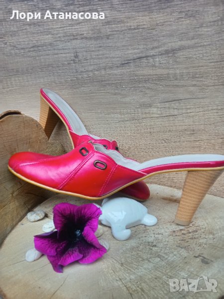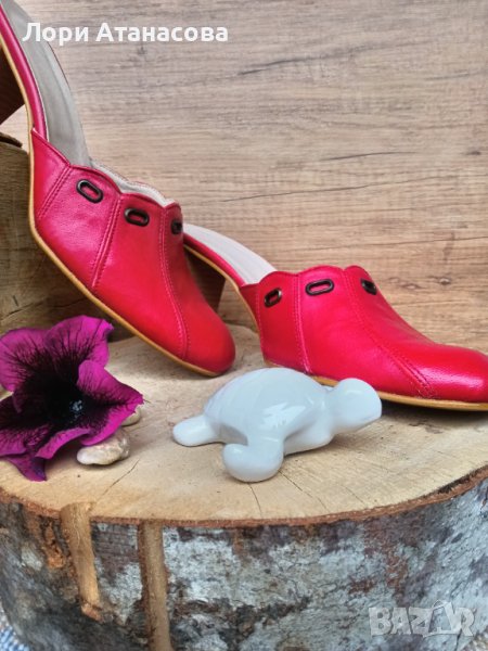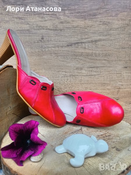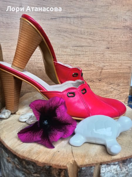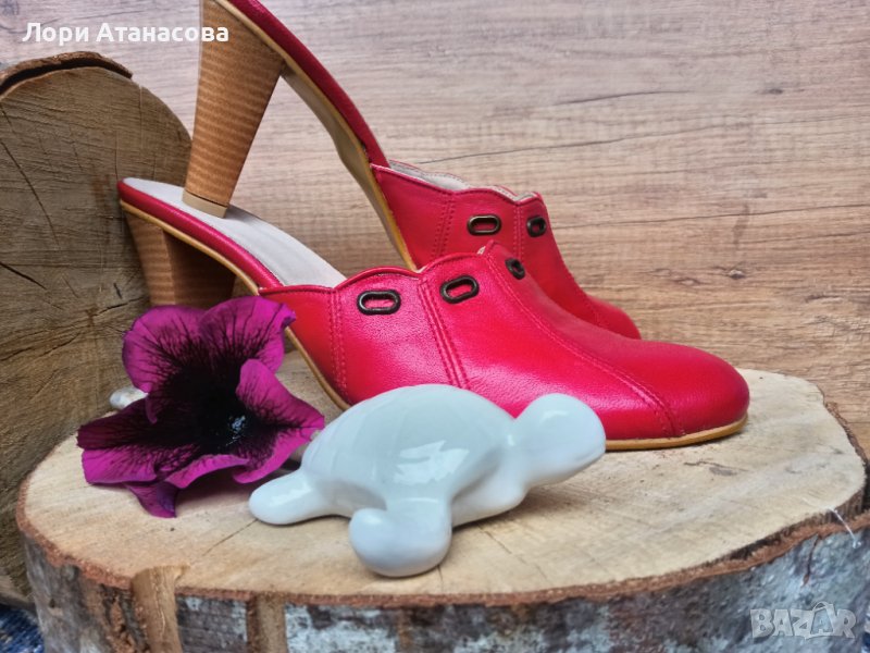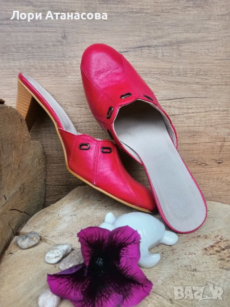 Червени дамски чехли, изработени изцяло от естествена кожа. Ходилото е с удобна извивка, среден ток → Обява 41816328