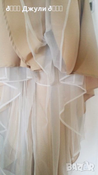 В телесен цвят, с подплата от бяла органза и бяла рязана дантела на бюстието /може да се носи със или без сутиен, не прозира/ Асиметричен модел - отпред е къса, а отзад дълга. Закопчава се с цип по дължината на гърба. Носила съм я веднъж на сватба и не е обличана повече. Стои много ефектно, но и елегантно.