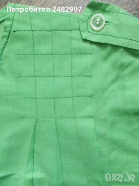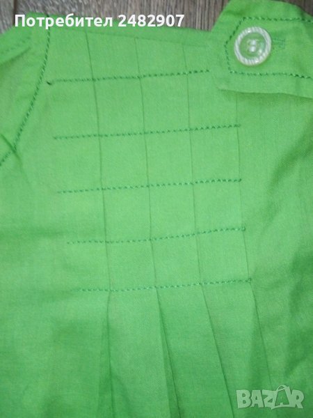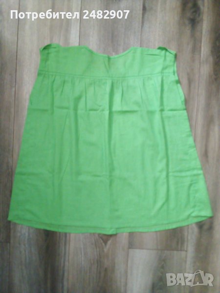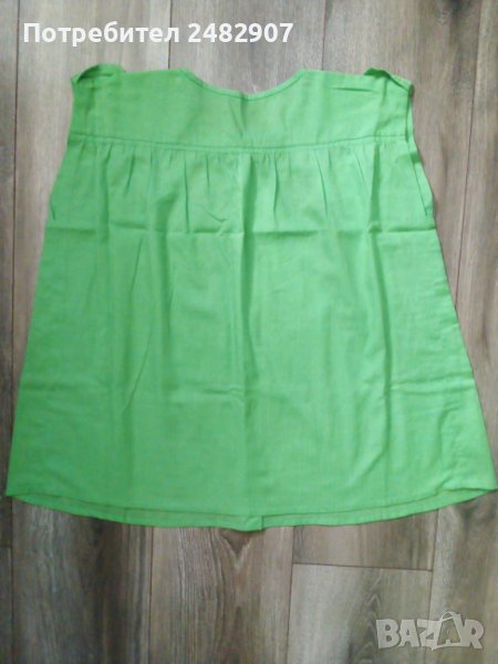 Зелена дамска лятна блуза с плохи, размер L. Ширина в раменете - 44 см, ширина под мишниците - 52 см, ширина в долната част - 68 см, дължина от рамото до долу - 60 см. Много запазена, почти не е използвана, много тънка и приятна на допир, без забележки.