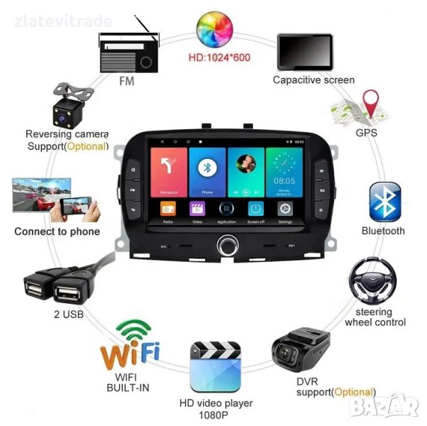 - дисплей с автоматично регулиране дневен/нощен режим в зависимост от интериорното осветление на автомобила и 1024/600 резолюция - HD капацитивен тъч