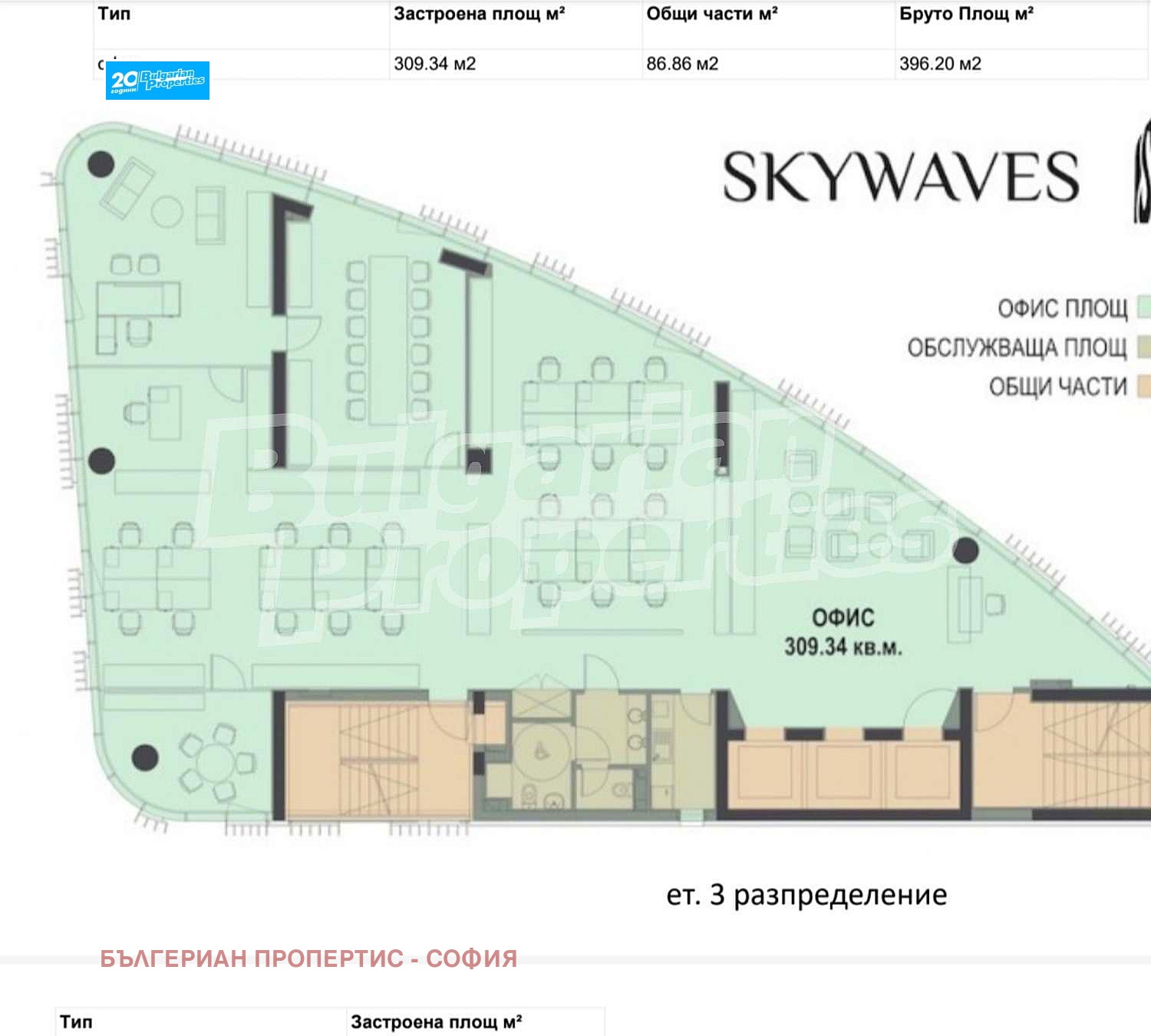 Фасада - решена като окачена стъклена фасада с вертикални слънцезащитни декоративни елементи от алуминиеви профили в бял цвят. Изпълнена е с алуминиеви профили Reynaears Aluminium, система CW50Fu и трислоен стъклопакет Guardian Glass, модел стъкло SunGuard SNX 60 (пропуска в интериора 60% от естествената дневна светлина и едва 28% от слънчевата топлина една от най-високите селективности (съотношението на светлинното предаване към слънчевия фактор) на пазара, триплекс със звукоизолационна мембрана. Стъклата са тройно ламинирани със сребърно покритие, като коефициентът на топлопреминаване Ug=0.5 W/m2K и g-стойност от 28%, осигуряващи оптимален енергиен баланс през цялата година. Фасадата е проектирана с най-високи изисквания за енерго-ефективност на профилите и стъклопакетите, както и към звукоизолиращи и соларни фактори. Фасадната система е капачкова. Предвидени са плътни вертикални декоративни части по фасадата, които ще позволят подобряване на цялостния енергиен модел на сградата и ...