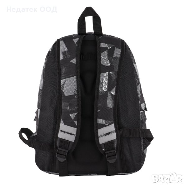 Черна раница със сиви форми.Има 2 големи джоба, външен джоб, страничен вътрешен джоб за мобилен телефон, изход за кабел за слушалки и вътрешен джоб с цип.Има подсилен EVA гръб, регулируеми презрамки със светлоотразителни ленти, метални ципове и дръжка.Заедно ще имате бандана за врата или главата в черен сив цвят.