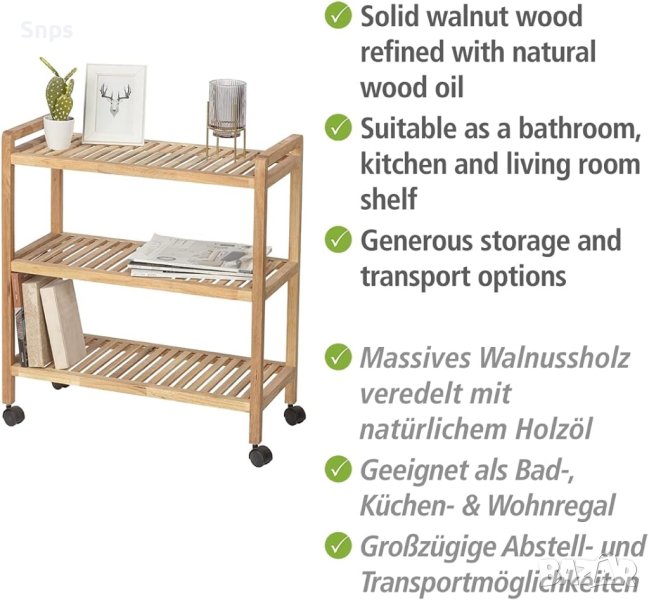 Висококачествен материал: количката за кухня и баня е изработена от масивна орехова дървесина, омаслена с естествено дървено масло и внася естествено усещане във вашия дом