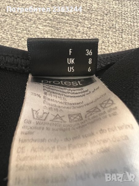 Бански Protest,купуван от Белгия. Много удобен. Отговаря на размер XS/S. Има подплънки,които могат да се вадят. На последните снимки съм снимала и забележките му.
