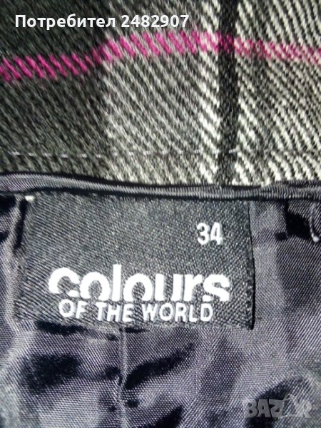 Къса дамска пола от фин вълнен плат - каре, с подплата, размер 34. Ширина в талията - 37 см, ширина в долната част - 47 см, дължина от талията до долу - 34 см. Много запазена, почти не е използвана, с имитация на джобове отзад и широки гайки в талията.
