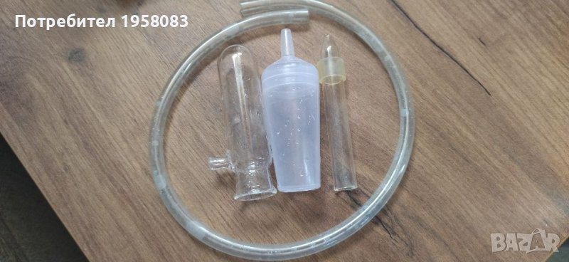 Частите на пластмасовия прибор за вакуумно почистване на носа: Всмукващ накрайник; контейнер за секрет (вътрешен цилиндричен контейнер, който може да се отдели от всмукващия накрайник; външен контейнер, към който се прикрепя всмукващият накрайник, а отстрани - силиконовата тръбичка); силиконова тръбичка (гъвкава); камбанообразен конектор за прахосмукачка.