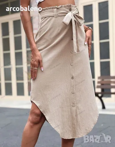 Открийте елегантността с нашата дамска пола с нестандартна висока талия. Изработена от първокласен полиестер, тази едноцветна пола се отличава с изящен асиметричен подгъв, стилна талия със завързване и шикозен дизайн с копчета. Перфектен за всеки повод и безпроблемно актуален.