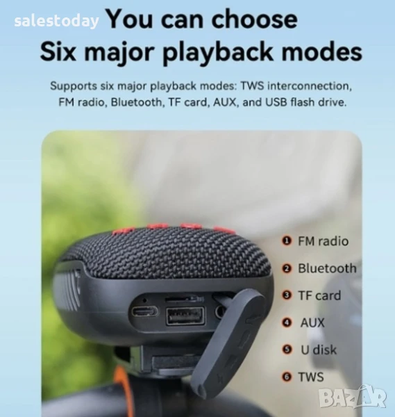 Поддържа 6 източника на слушане на музика - FM радио, блутут, TF карта памет, AUX, флаш памет, TWS връзка.