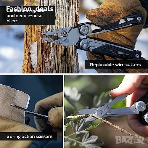 Комбинира стандартни клещи и клещи с игла, със сменяеми ножове за рязане на проводници и клещи за кабели.