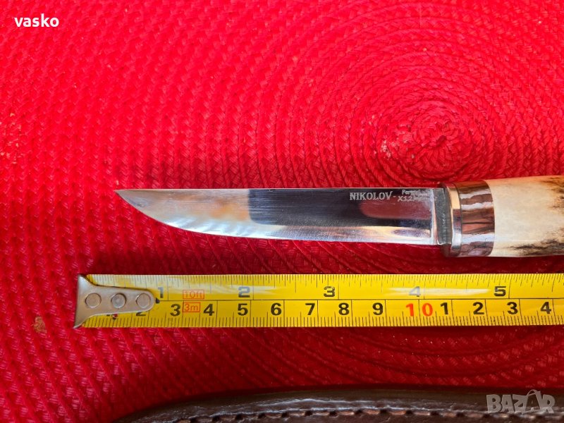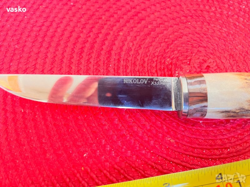 Ръчна изработка,кована стомана Х12МФ,обща дължина 20см,дебелина на острието при дръжката 4мм,ширина на острието при дръжката 1,7см,дръжка Еленов рог и пръстен от фосил на мамут,метална тапа,кожена кания ръчна изработка правена за ножа.Нажчето е много здраво-закалено та 60 единици във вакумна пещ и напълно функционално.