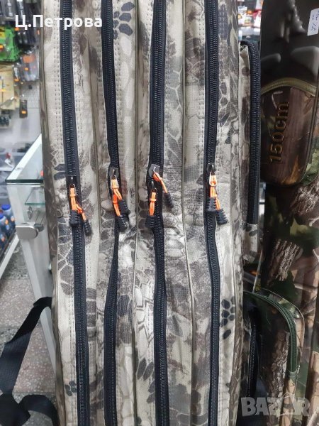 Луксозен калъф с четири отделения, предназначен за четири въдици с макари. Подходящ за двуколенни, триколенни или телескопични пръчки. Калъфът е от солиден и здрав, непромокаем промазан материал с камуфлажна шарка. Позволява удобно и лесно съхраняване и транспортиране на въдиците. Снабден е с уширения, в които се побират макарите. Прибавени са 2 странични джоба с ципове за различни риболовни аксесоари. Солидните ципове придават завършеност на този висококачествен калъф. Предлагат се в три размера: