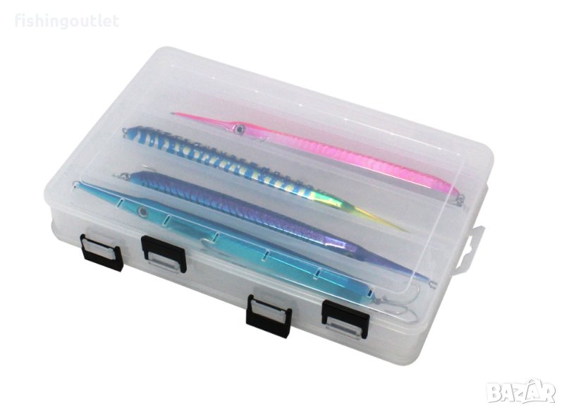 Двустранна прозрачна кутия модел H1701-B за съхранение на риболовни примамки, която е изключително подходяща за по-дълги примамки (до 26 cm). Кутията е изработена от здрава и надеждна пластмаса и е снабдена със сигурни закопчалки, които няма да позволят изпадането на примамки. Прозрачният капак допринася за леснoто и бързо откриване на нужния воблер.