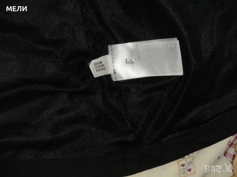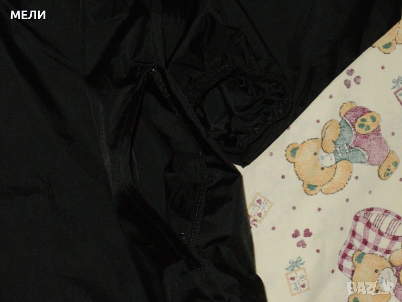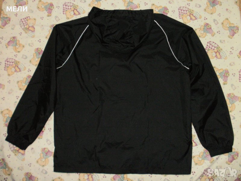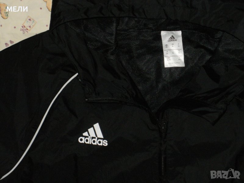 Якето е на ADIDAS, оригинално, ново, без забележки. По номер е ХL но е леко уголемено, сравнете мерките. Цвета е черно и бяло. Материята не пропуска дъжд и вятър. Закопчава се с цип и отпред има два джоба с ципове. На качулката има ластик със стопери. Тънка мрежеста подплата.
