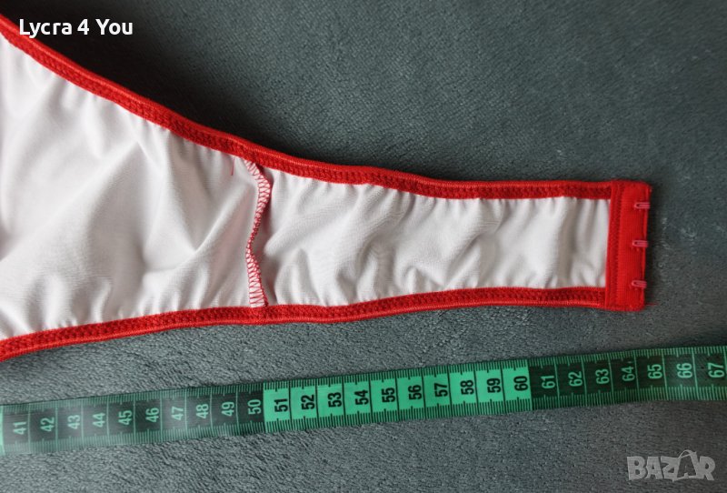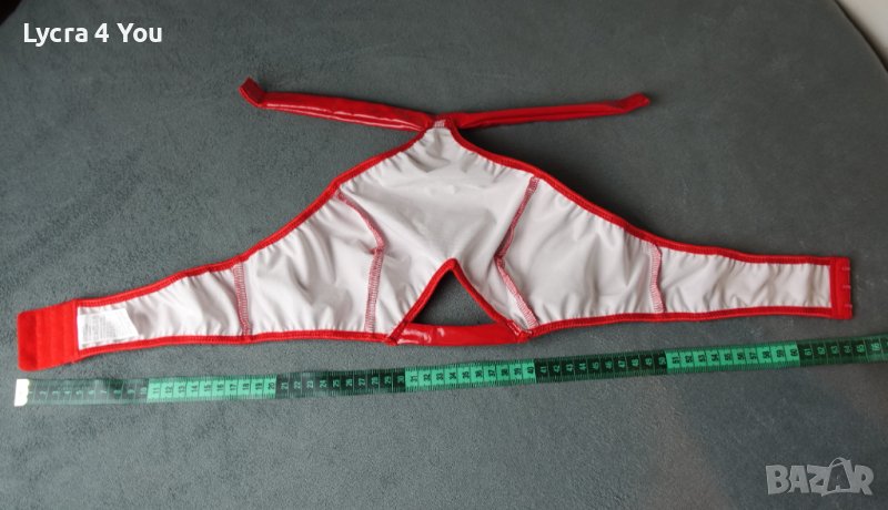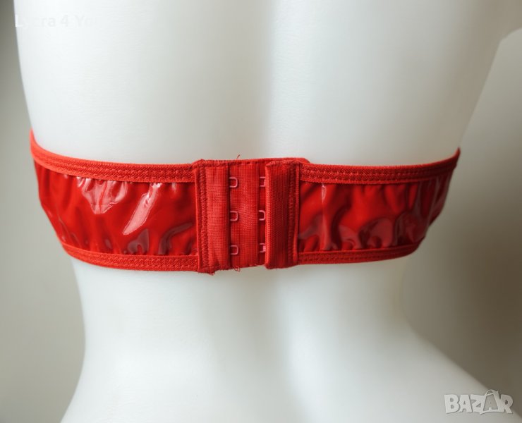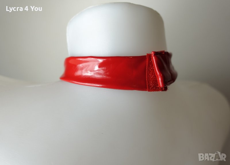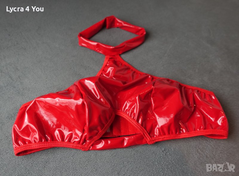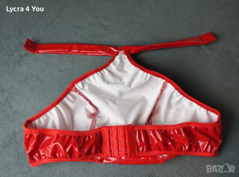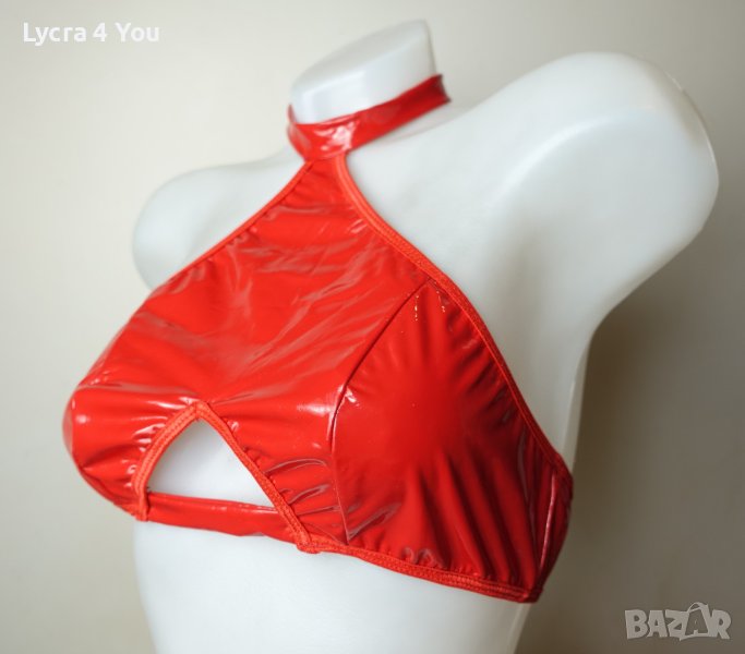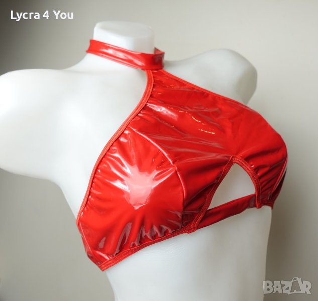 Дамско късо червено лачено/винил/ pvc бюстие/топ с меки чашки, с закопчаване отзад тип сутиен (три реда с кукички) и с чокър за врата с велкро лепка.