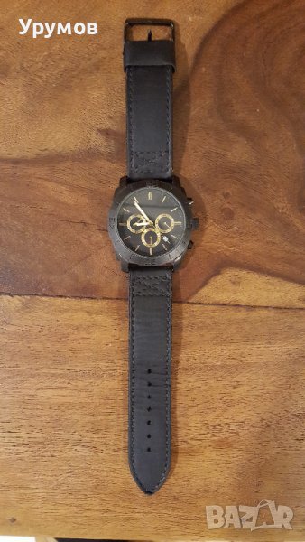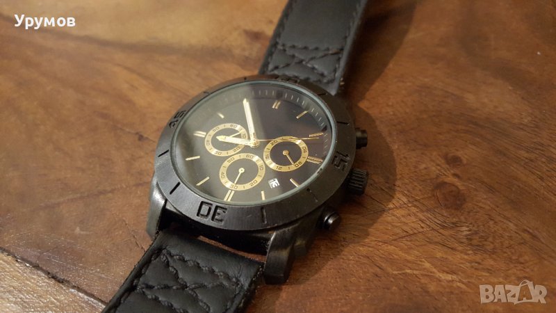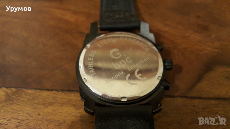Китайски хронограф със стабилна каишка от естествена кожа. Нова батерия. Марка: bpc /bonprix collection/. Бутоните работят. Часовникът е със следи от употреба, но нищо фрапиращо. Леки драскотини по кристала. Часовникът е доста голям – размер на касата без коронката 45 мм.