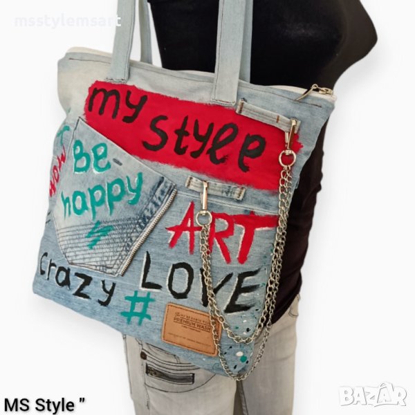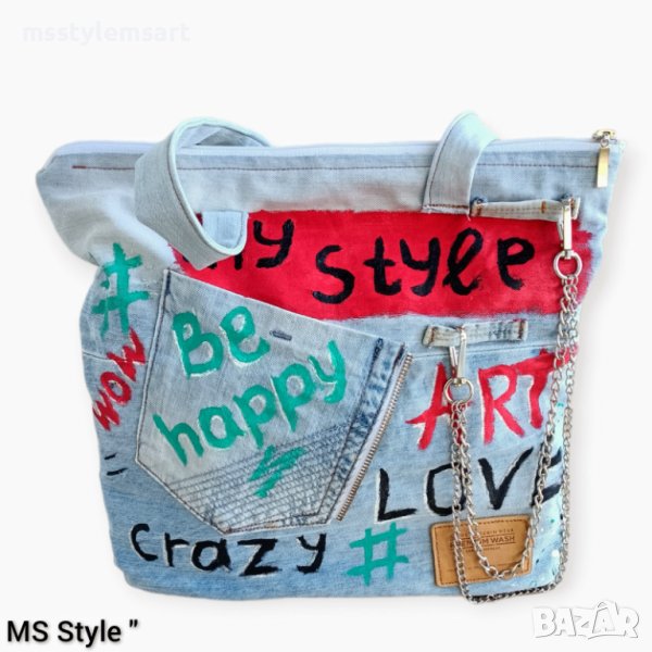 Чантата е с #две #лица, #ръчно #рисувана с #текстилни #бои и #ръчно #изработена от #деним, с #декорация от #джобове, #метални #синджири които се свалят, #метални #ципове, #гайки и #кръпки, различна от двете страни, с #едно #отделение закопчава се с #цип, с #две #дръжки за рамо, с #подплата и #вътрешен #джоб. Размери: цип 35 см, дълбочина 30 см, дъно 30/27 см, цена 80 лв, препоръчвам ръчно пране или в пералня на 30 градуса.