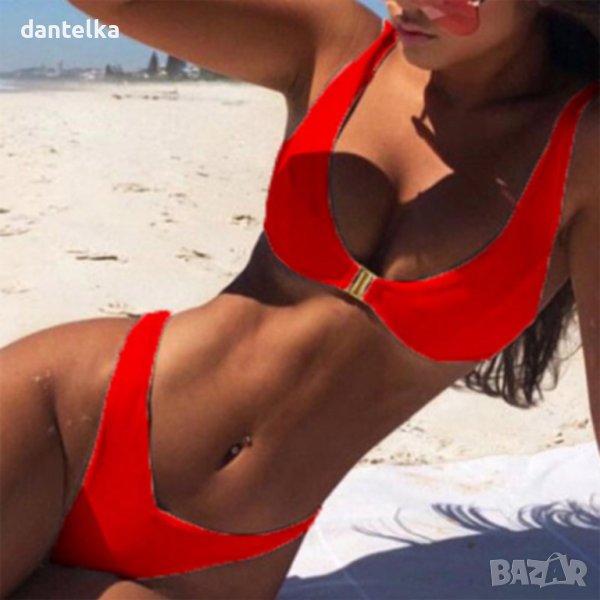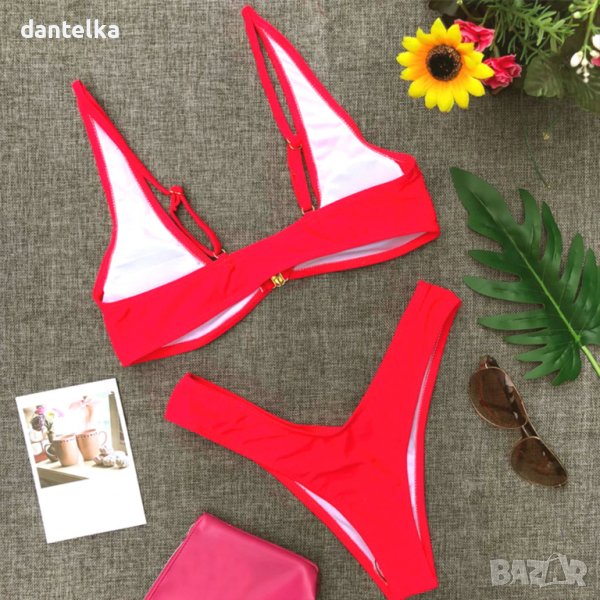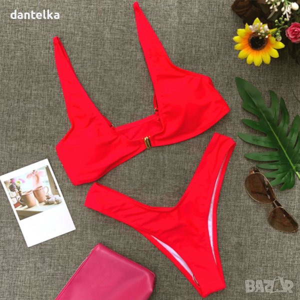 Предлагаме ви един нов, атрактивен, модел бански костюм от две части, изключително провокативен и секси, за най-дръзките дами. Горнището за удобство е с предно закопчаване. Модно долнище на бански с висока талия. Този секси бански ще акцентира върху достойнствата ви и ще ви превърне в истинска богиня на плажа. Бански костюм в наситено червен цвят, символ на нежност и романтика. В този модерен бански костюм ще изглеждате нежно, зашеметяващо и луксозно.